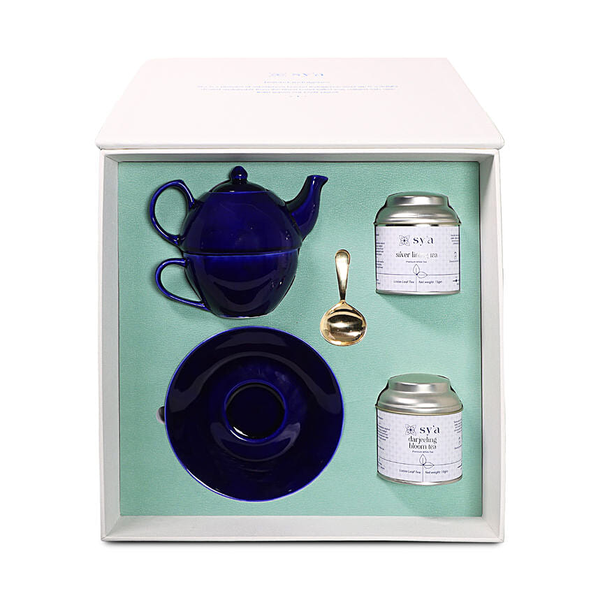 This is an indulgent yet most practical gift to celebrate tea and self-love alike. the hero of this set is a unique combo of a kettle, cup & saucer - as unique and self-contained as you. made complete with a tin of any of our finest herbal infusions or our signature deep blue tea and an infuser measuring spoon.