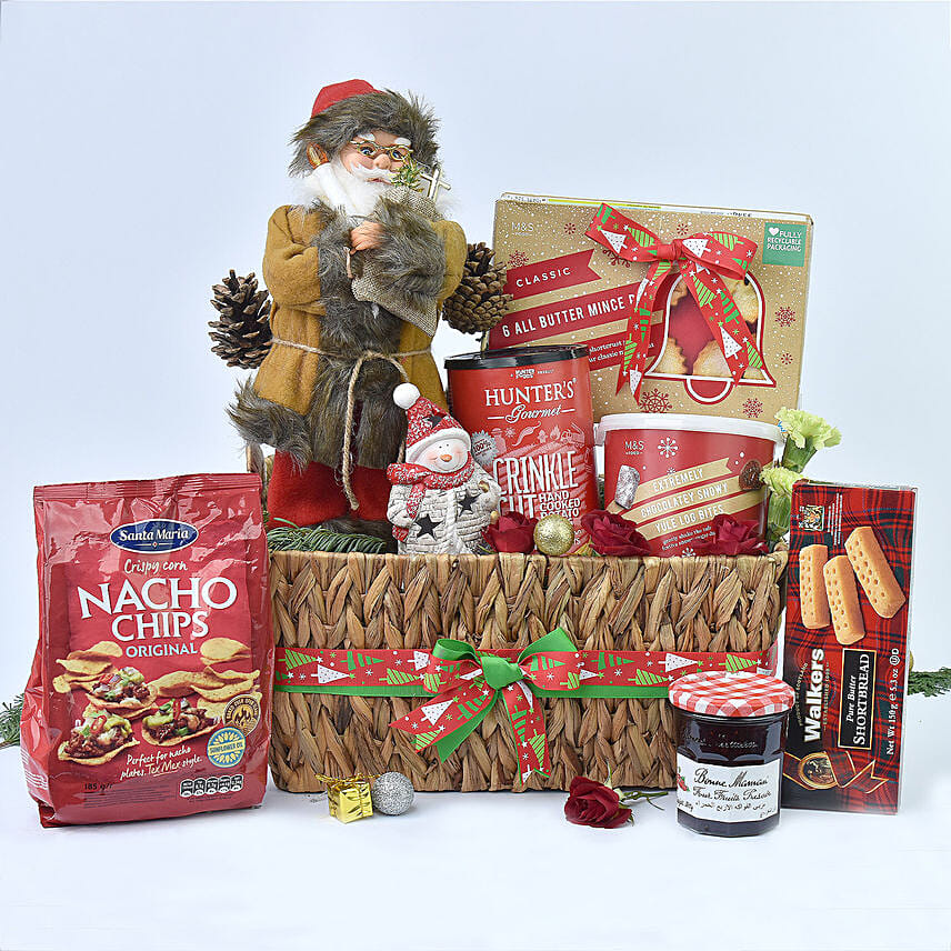 A Christmas gift basket full of Santa goodies. With a Snowman lamp, Santa Claus to cookies and chocolate bites, a showstopper gift hamper to steal the hearts of your loved ones. Send Christmas in a basket with this festive hamper.