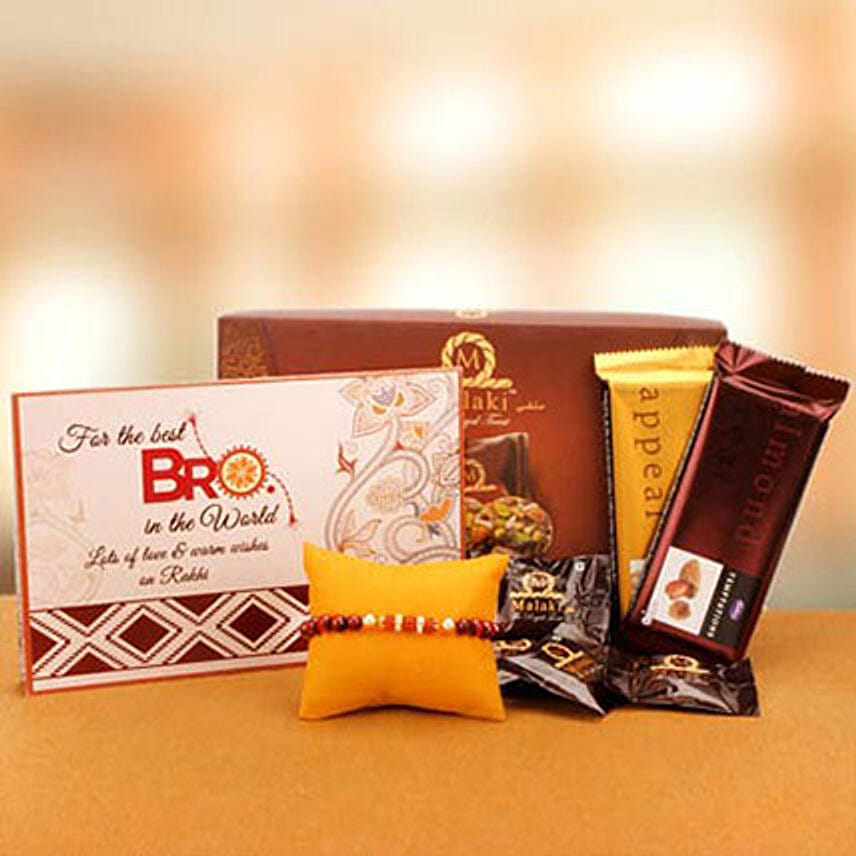 • Temptations Almond Treat 72 gms and Rudraksha with Red beads Rakhi