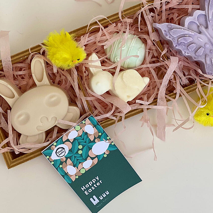 • A wooden tray with a selection of natural handmade soaps in Easter themed shapes to compliment your decor on this happy and blessed occasion