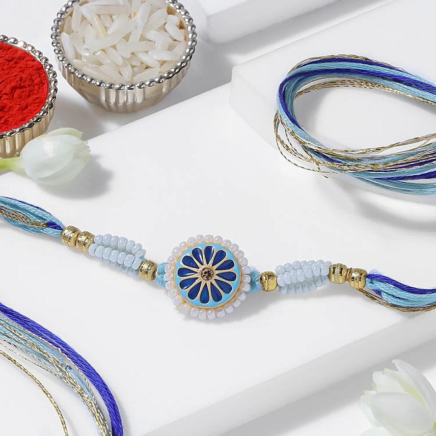 Adorn your wrist with our exquisite blue and pink meenakari rakhi, featuring white pearls, golden beads, and a blue thread. The intricate design includes a floral motif on the central bead, adding a touch of elegance. The white pearls symbolise purity and innocence, the golden beads represent wisdom and prosperity, and the blue colour signifies trust, loyalty, and wisdom. A traditional Indian craft, this rakhi is a perfect way to celebrate the bond of sibling love and friendship for the brother who truly values tradition and elegance