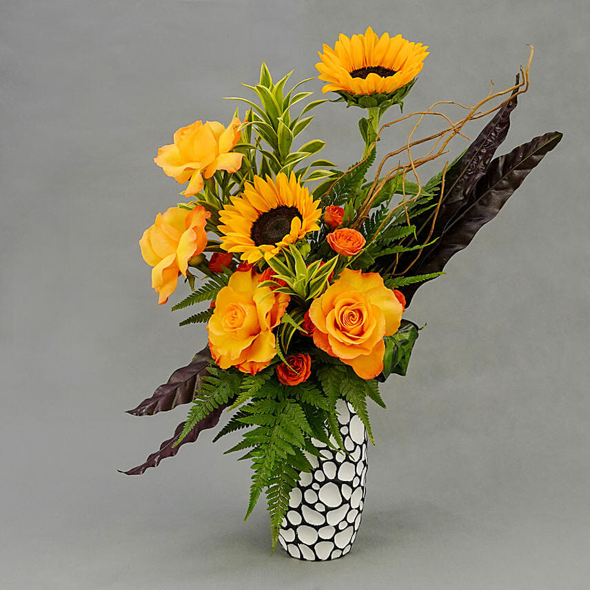 Bring sunshine to the table with this vibrant set of flowers. With orange roses and sunflowers, spread confetti of happiness in someone special’s life. The addition of green balances the visual appeal without overwhelming the senses. The abstract white vase elevates the designer aesthetics of this brighter than sunshine arrangement.