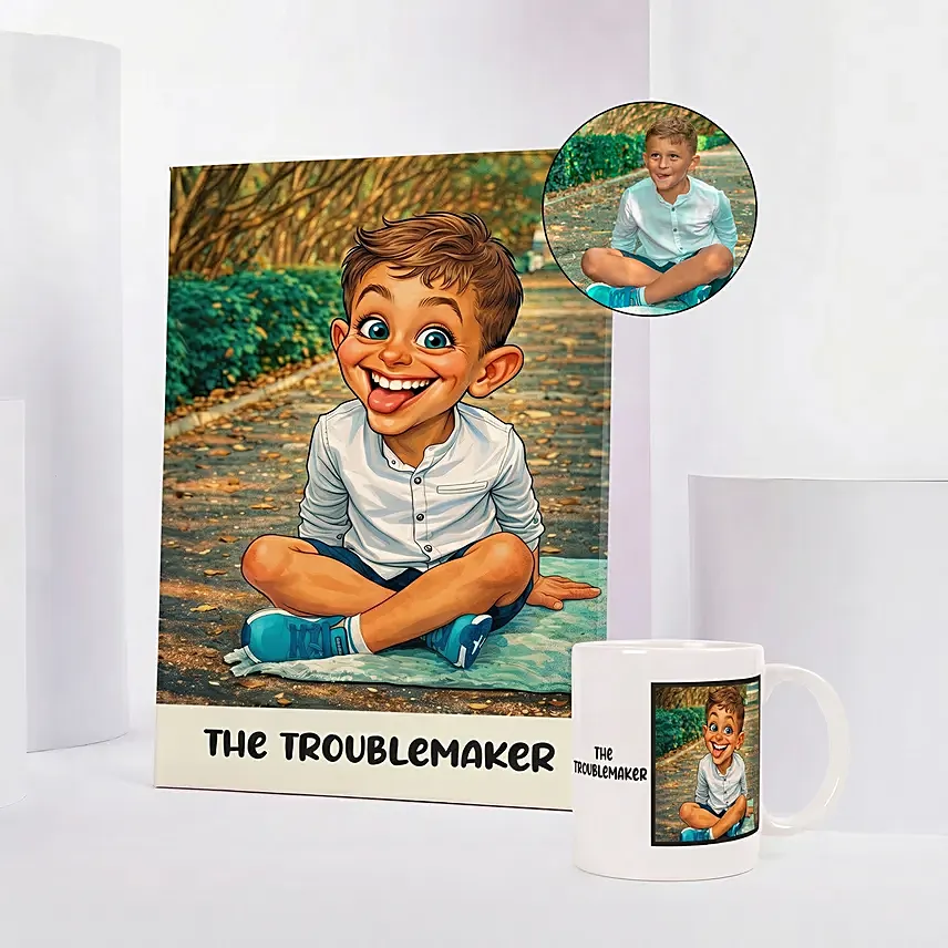 Celebrate the mischievous side of life with the "The Troublemaker Caricature and Mug Set." This personalized gift captures the playful spirit of a little troublemaker, making it the perfect keepsake for kids or anyone who adds a little fun to the world. Paired with a custom mug, this set is ideal for birthdays, celebrations, or just to highlight the cheeky charm of your favorite "troublemaker."