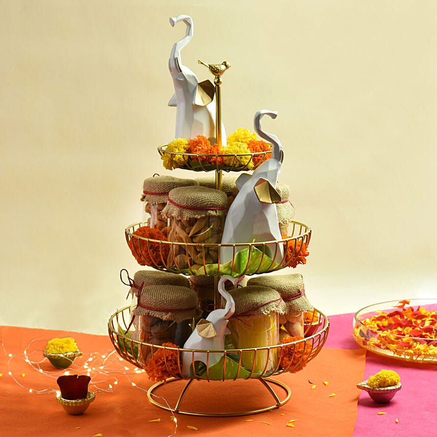 Send across your heartiest wishes as well as good health to your loved ones on Diwali with this hamper. It has got Namak Para, Samosa, Muruku, Matthi, Chocolate Cookies, Plain Cookies, Shakar Para, Dried Mango, Set Of 3 Decorative Elephants arranged altogether beautifully in a Designer stand.