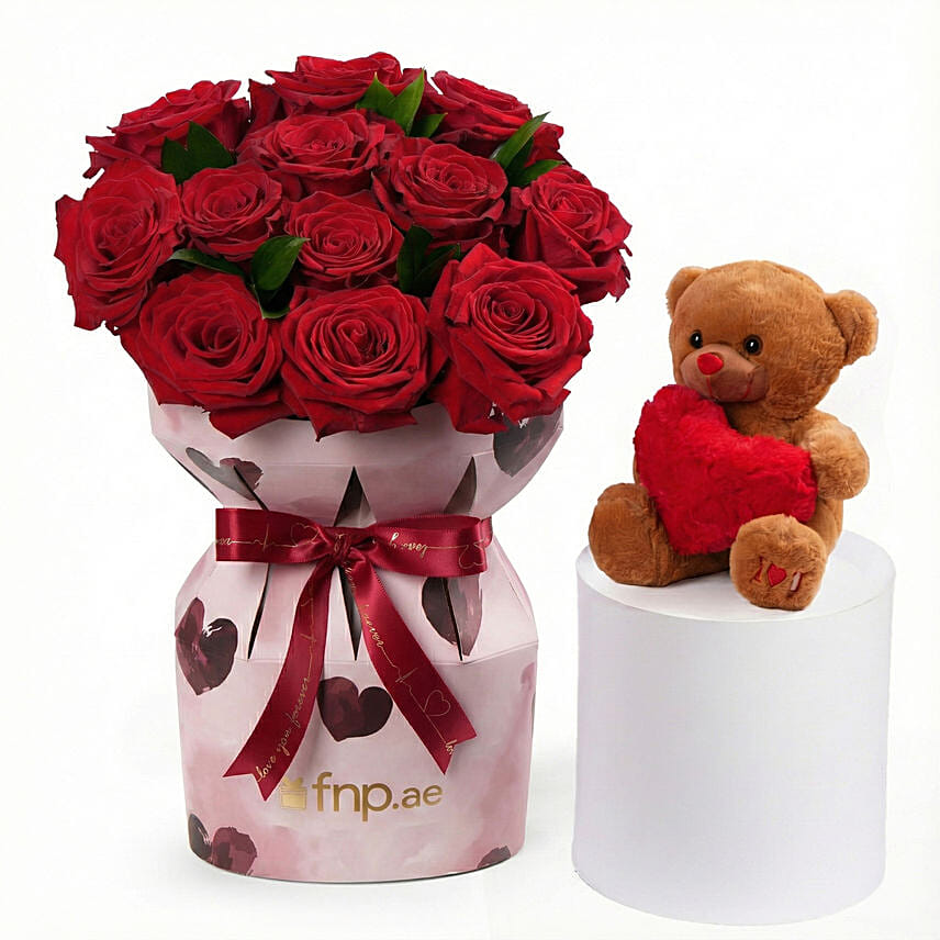 Timeless Elegance 15 Red Roses Love Box with Teddy