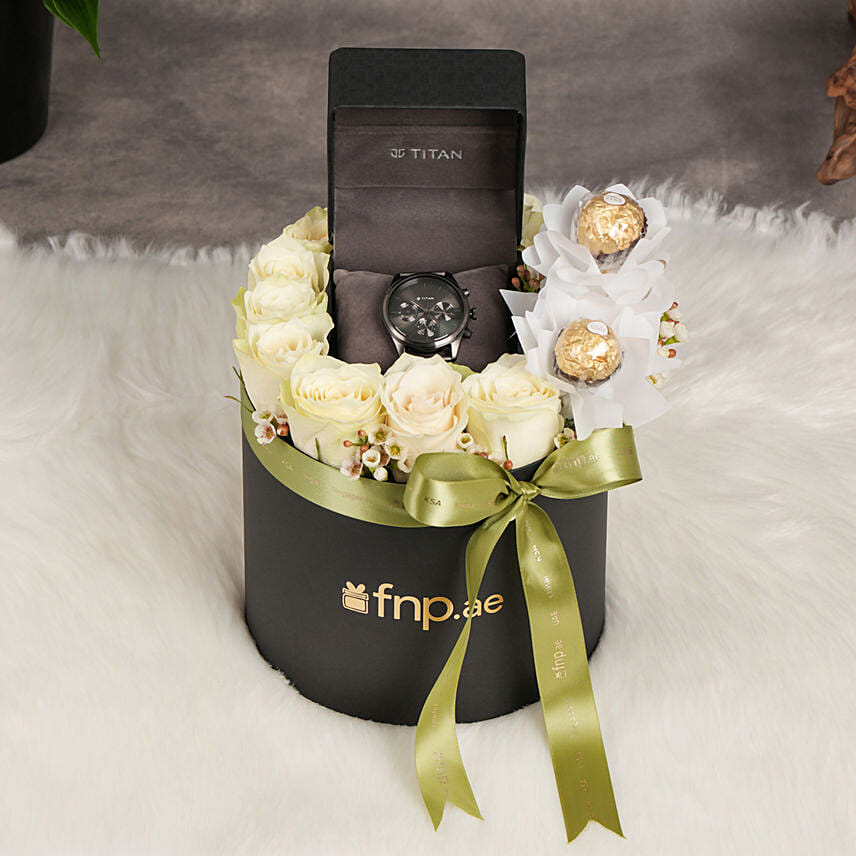 Celebrate his style and sophistication with the Titan Quartz Analog Anthracite Dial Watch, elegantly presented in a round gift box adorned with white flowers, and delectable Ferrero Rocher chocolates. This luxurious gift set is perfect for making any Birthday, Anniversary, Best Wishes or any occasion unforgettable. Titan Quartz Analog Anthracite Dial Watch: Stylish Design: The Titan Quartz watch features a sleek anthracite dial, exuding modern elegance and sophistication. Analog Precision: Reliable analog movement ensures accurate timekeeping, combining functionality with style. Stainless Steel Strap: The durable stainless steel strap offers a polished look, suitable for both everyday wear and special occasions. Trusted Quality: As part of the esteemed Titan brand, this watch stands for quality, precision, and exceptional craftsmanship.