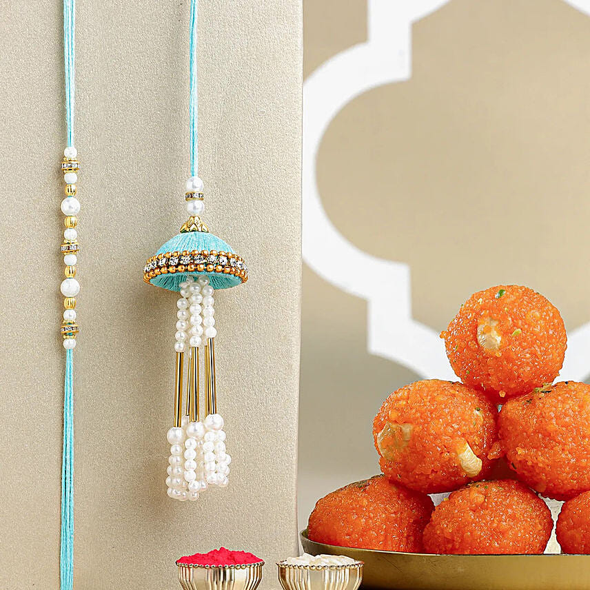 Tranquil Teal Jhumar Bhaiya Bhabhi Pearl Rakhi Set N Ladoo Combo