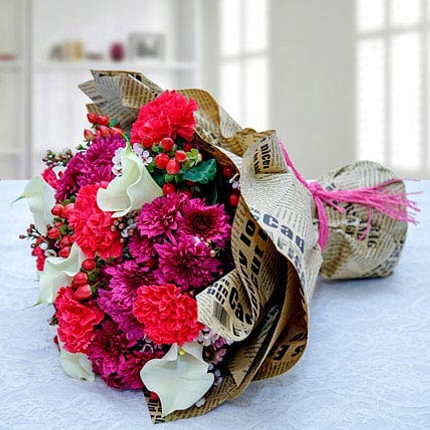 What is adding a flair of interest in this bouquet is the unique newspaper printed wrapping paper. Dark, bright, and light shades of flowers are brought to form a cluster of love, modesty, innocence, simplicity, exuberance, chastity, and poise. Have this bouquet of colourful flowers ordered for an unconventional person.