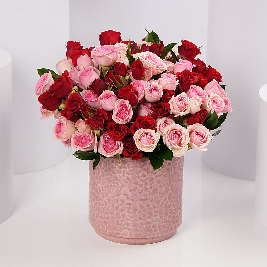 A dreamy Valentine’s arrangement — an abundant mix of blush pink and red roses arranged with grace, symbolizing romance, admiration, and heartfelt gifting. A soft yet striking expression of love made to leave a lasting impression.