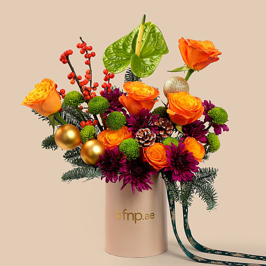 • Features : Vibrant Combination of Roses, Chrysanthemums & Festive Elements; Perfect for Brightening Up Holiday Spaces