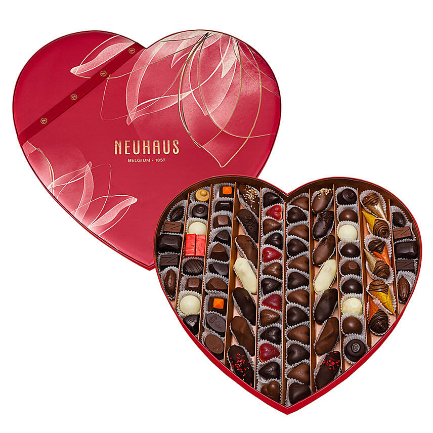 • The VIP Valentine heart Box contains 84 iconic Neuhaus chocolates; a selection of praliné, ganache, caramel and gianduja filled pralines.