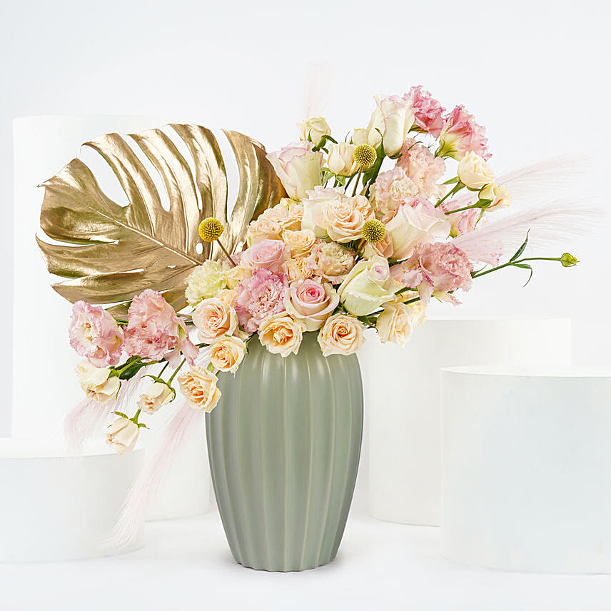 This luxurious and artistic floral arrangement is a perfect blend of elegance and modernity. Featuring a stunning mix of blush pink and peach roses, it exudes softness and romance, while the bold golden monstera leaf adds a glamorous and contemporary touch. The delicate pampas grass accents enhance the arrangement's texture, creating a whimsical yet sophisticated look. Housed in a sleek, ribbed white vase, this design makes a statement of timeless beauty and refinement. Perfect for grand celebrations, anniversaries, or simply as a centerpiece to elevate any space, this arrangement symbolizes grace, luxury, and charm.