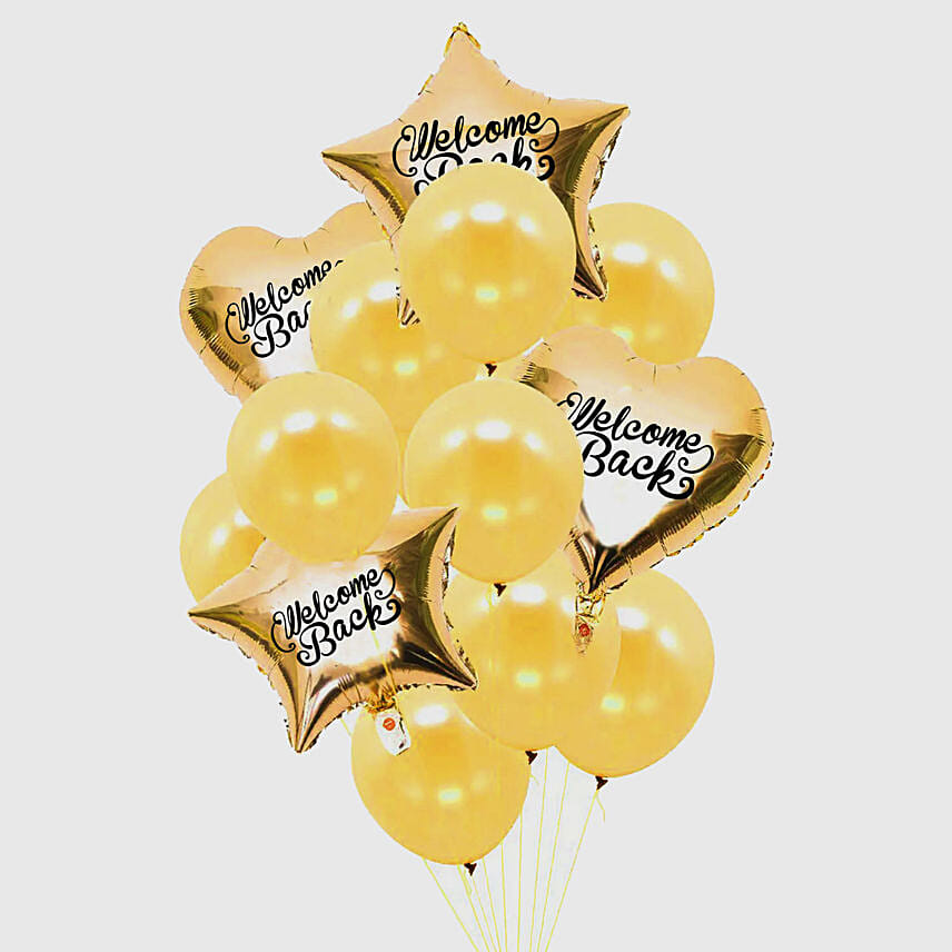• 2 Heart and 2 star Shape Golden Balloons with Welcome back Text