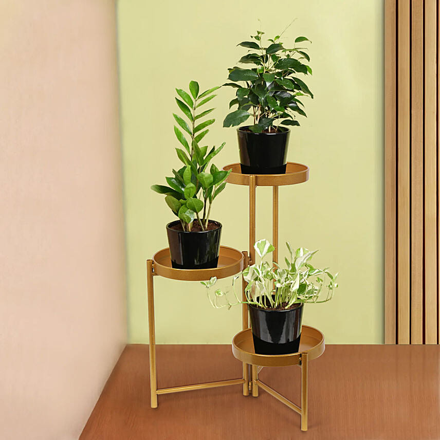 Product Details: All The Plants Are Planted In A Black Ceramic Planter & Arranged In 3 Tier Iron Stand