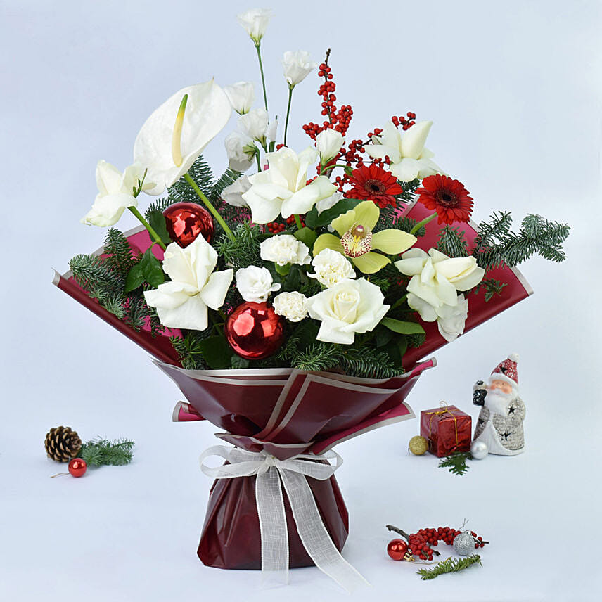 Spoil your loved one with this bouquet of Christmas spirit which is beautifully arranged with roses, carnations, anthurium, and other blooms along with Xmas decorations. A festive special arrangement perfect for sending joyful wishes on the Jolly day.