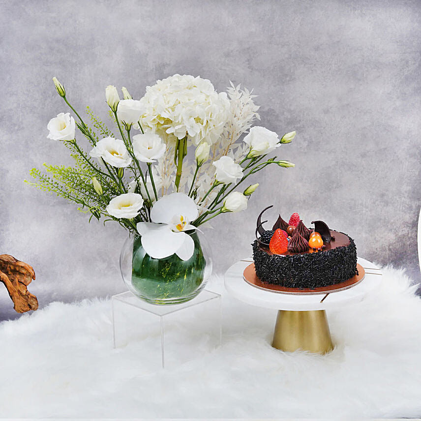 White Beauty Flowers with Chocolate Fudge Cake