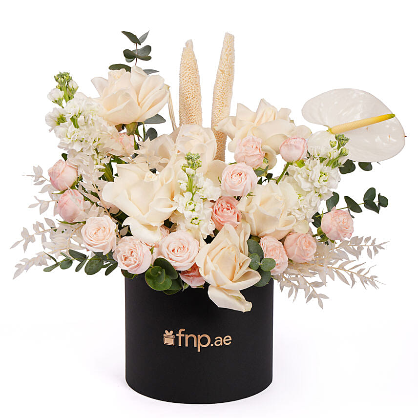 A luxurious mix of white roses, anthurium, and mathiola, accented with pink spray roses, eucalyptus, lagurus, and babla for a refined, elegant arrangement with a soft pastel touch.