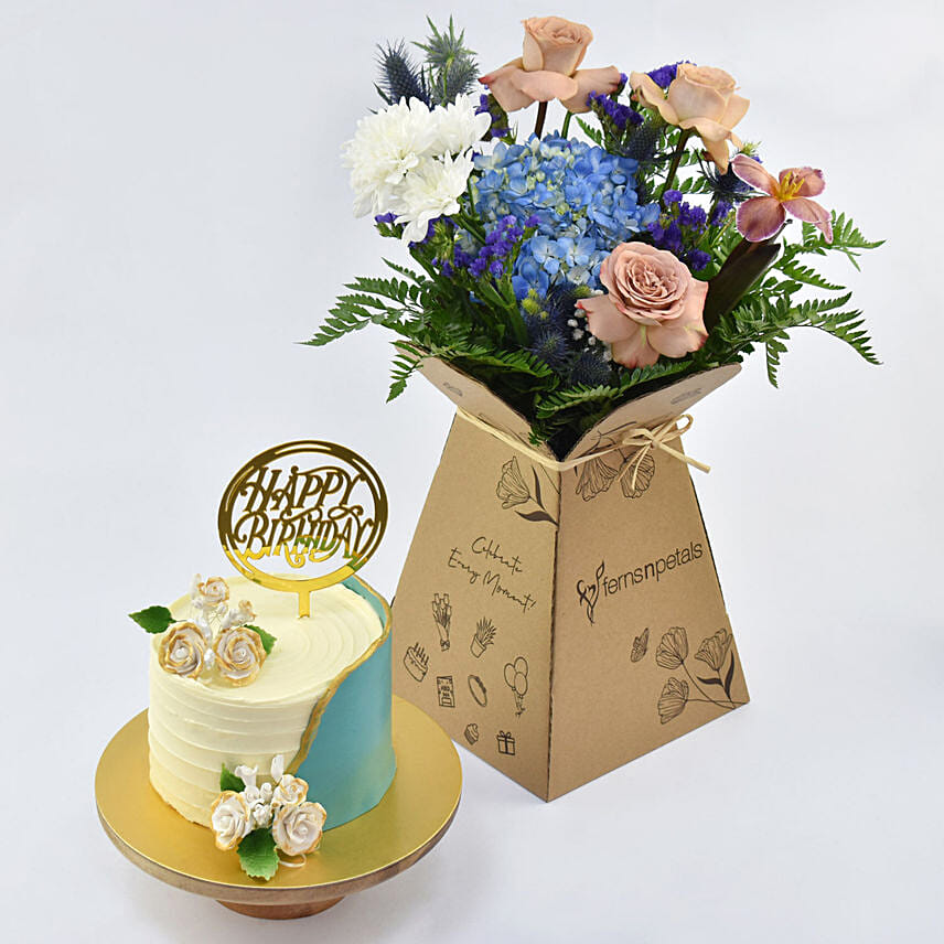 This delightful birthday cake along with a bouquet is the perfect combo for your loved one's birthday.