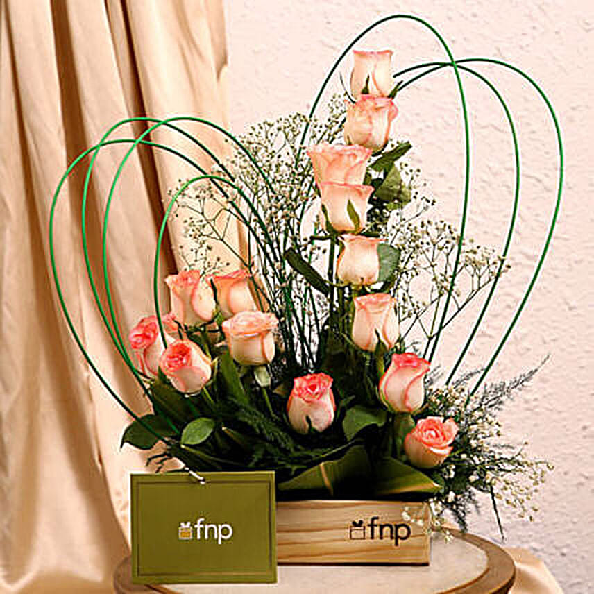 A strikingly beautiful arrangement of roses on a wooden base. The roses are handpicked and arranged by experts which gives them the fuss-free look. The addition of greens ensures a beautiful pop of contrasting colour.