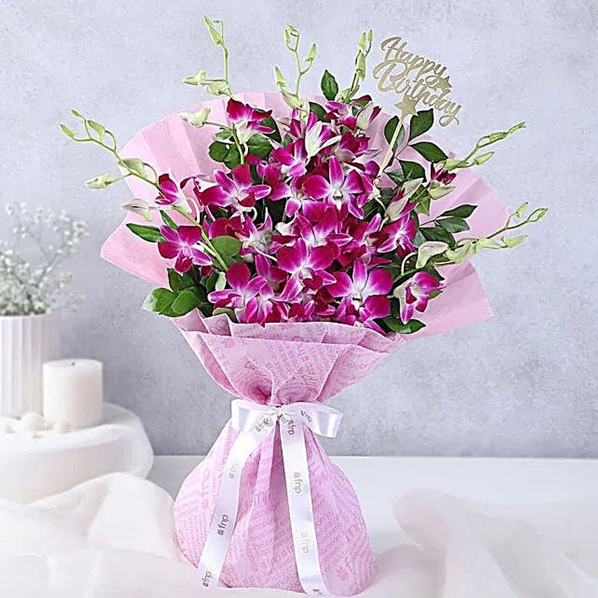 Make their birthday unforgettable with our exquisite bouquet of purple orchids. This stunning arrangement features graceful orchid blooms, a symbol of luxury and admiration. At its peak, a golden "Happy Birthday" topper adds a touch of celebration. The perfect gift to express your warmest birthday wishes and make their day truly special.