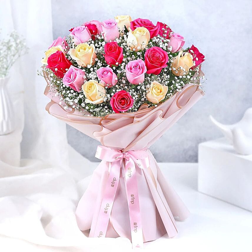 Crafted with an array of emotions, our bouquet showcases the gentle allure of peach roses, the tranquil beauty of aqua pink roses, and the bold charm of dark pink roses. This vibrant blend is an ideal gift for someone special, symbolising gratitude, admiration and deep affection. Perfect for expressing heartfelt sentiments to a cherished friend or loved one, the diverse hues promise to bring joy, serenity, and passion into the recipients life.