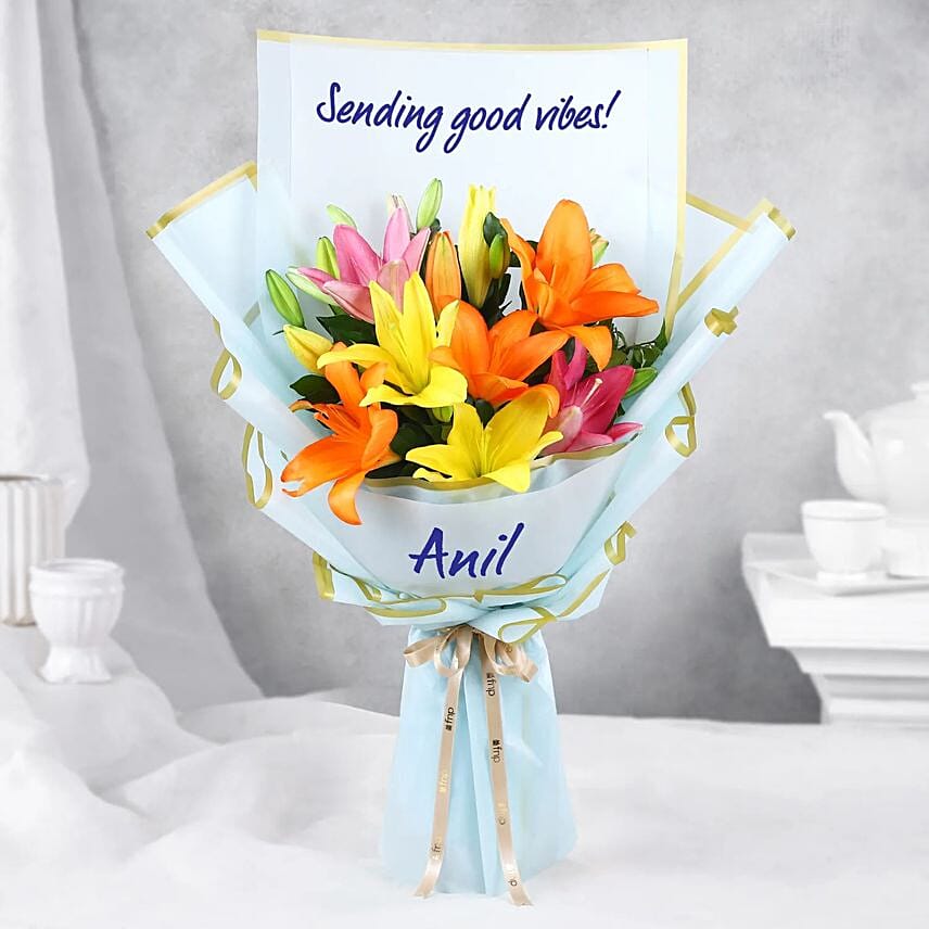 Brighten someones day with this vibrant bouquet of orange yellow and pink lilies accompanied by the cheerful message Sending Good Vibes. Symbolizing purity joy and admiration lilies convey heartfelt emotions like a soothing embrace. Personalise it with a name to make it even more thoughtful. Perfect for friends family or anyone in need of positivity this bouquet is a radiant reminder that every new dawn brings hope and happiness.