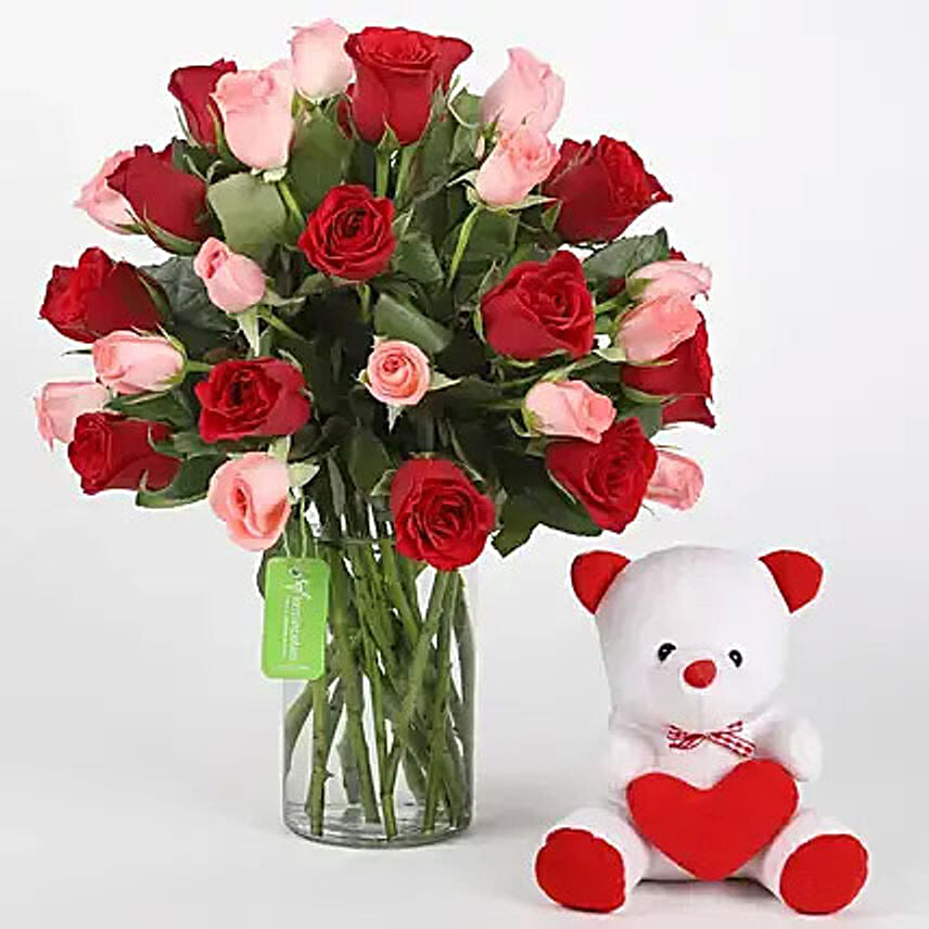 Red and Pink Roses With Teddy Bear
