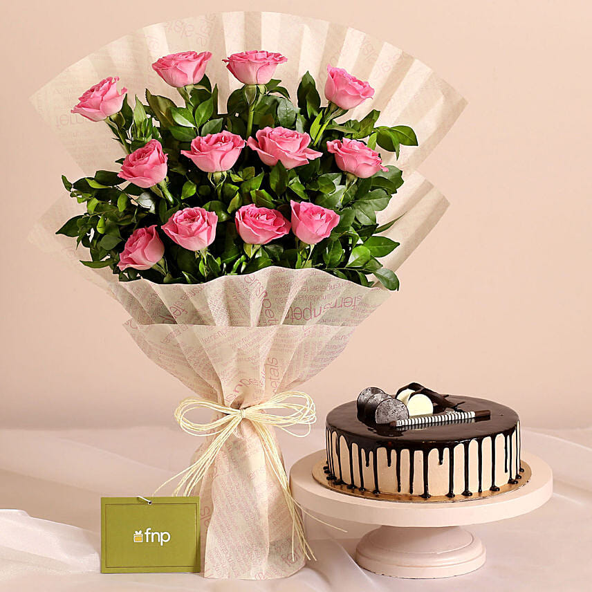 Sweet Memories Pink Roses Bouquet And Chocolate Cake