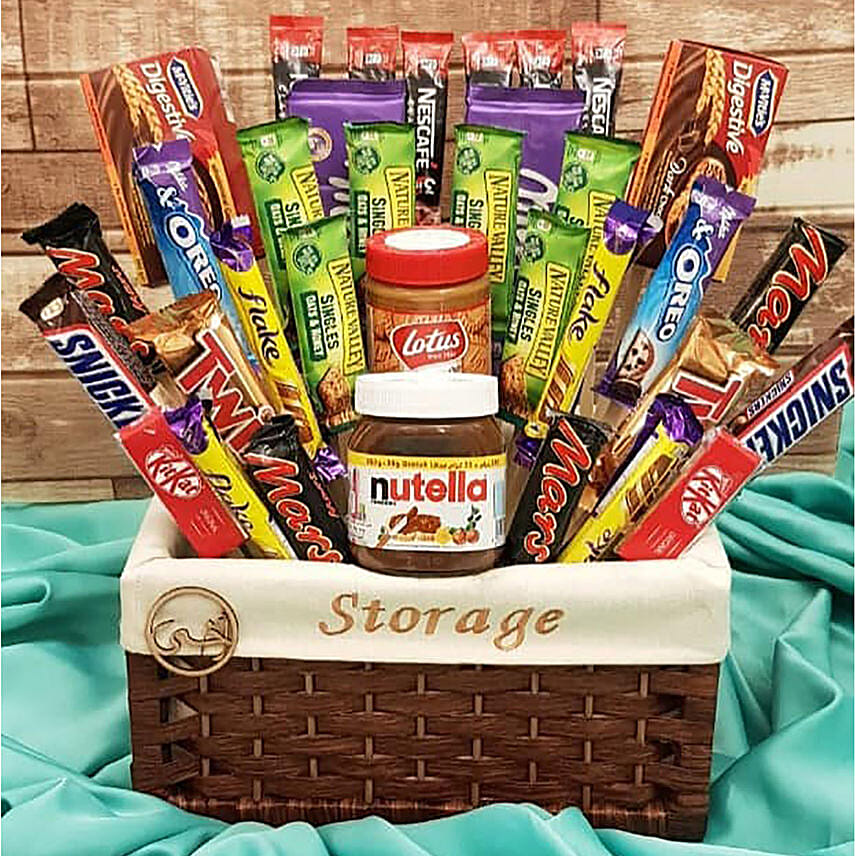 Nothing says love like a basket of delectable goodies. Show your loved ones your adoration and love with this gift basket of chocolate bars, biscuits, lotus spread, and Nutella! Give your friends, family, or that 'special someone' a sweet surprise and tell them you care with the yumtastic Basket of Happiness!