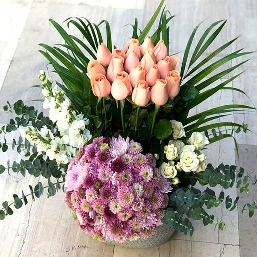 Roses are not sufficient to tell someone what they mean to you especially if they mean a lot of things at the same time. This collection of 15 Peach Roses, 5 Purple Chrysanthemums, 2 White Spray Roses, 3 Mathiollas stems, with Eucalyptus leaves will do justice to all that you want to say, in more words than you can think of! Trust us.