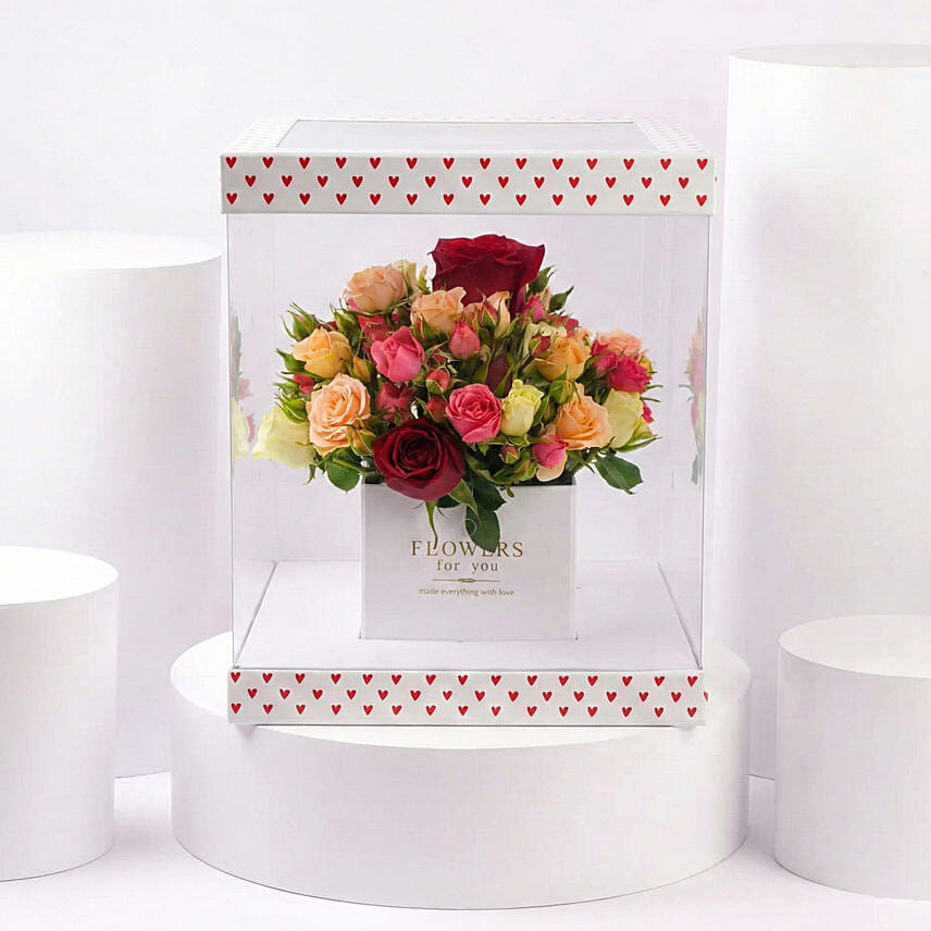 This elegant box arrangement showcases a beautiful blend of classic red roses and soft pastel spray roses, creating a charming and sophisticated floral display. Carefully arranged in a stylish presentation box, this design is perfect for expressing love, appreciation and warm wishes on special occasions.