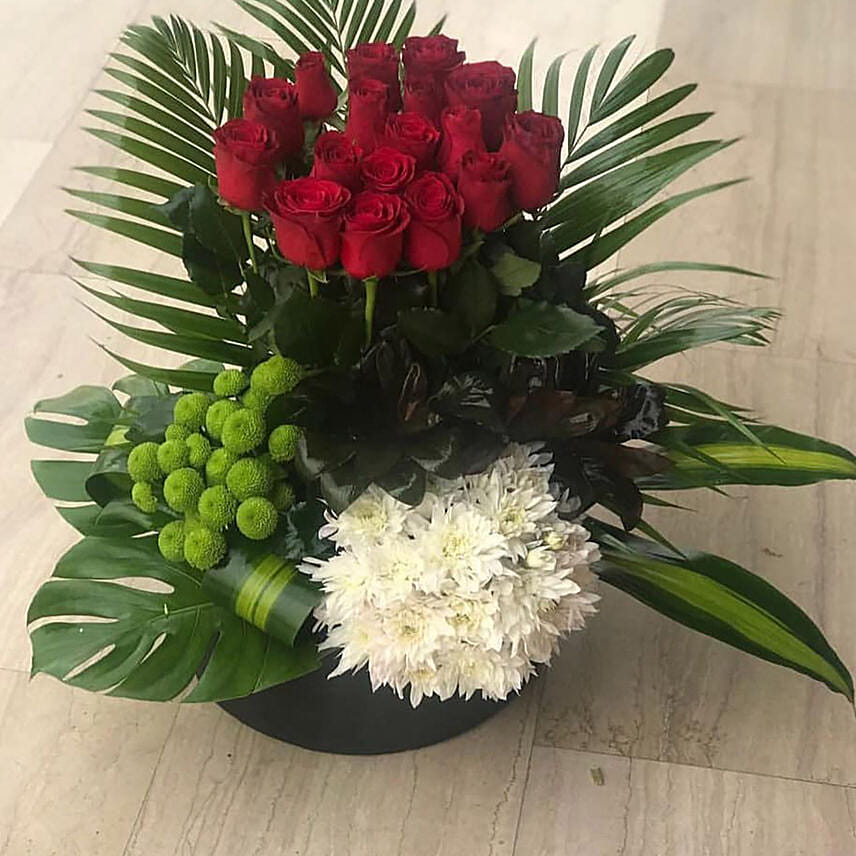 This mesmerizing arrangement of red roses and white flowers with green fillers is perfect to convey your hartfelt emotions during birthdays and anniversries. The gorgeous blooms will put a lovely smile on the recipient's face and make teir day special. Also, the arrangement would make a perfect decor item and fill the home with happy vibes.