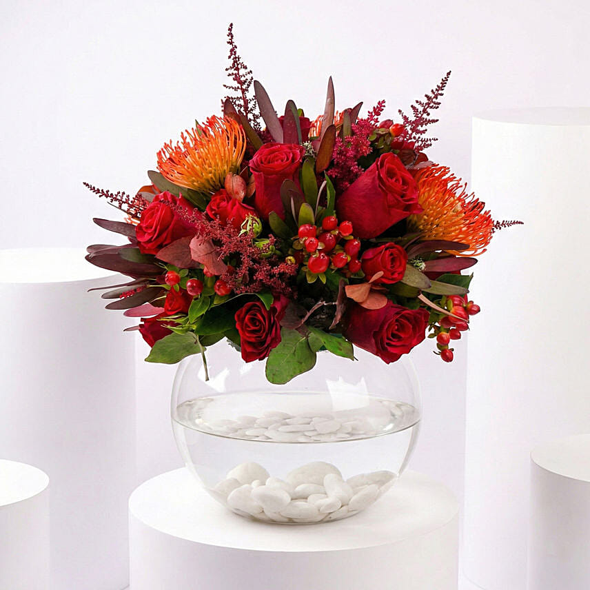 This elegant fish bowl floral arrangement showcases a rich blend of red blooms beautifully styled in a clear glass bowl. Designed to create a warm and romantic impression, this arrangement combines classic red roses with textured accents for a luxurious and eye catching presentation suitable for celebrations and heartfelt occasions.