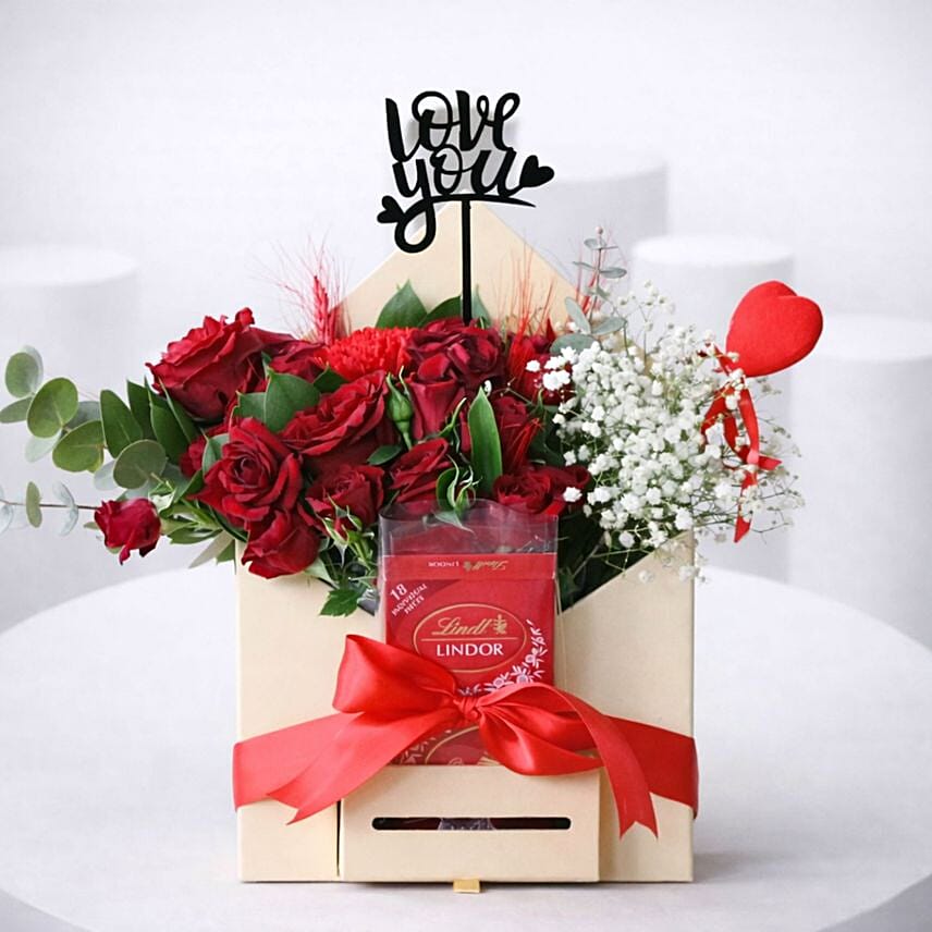 Surprise your loved one with a timeless expression of love through this elegant red rose and chocolate arrangement. The Love You Red Roses & Lindt Chocolate Gift Box features fresh red roses beautifully paired with delicate fillers, premium Lindt Lindor chocolates, and a romantic “Love You” topper. Designed in a chic envelope-style box and finished with a luxurious red ribbon, this arrangement is perfect for anniversaries, Valentine’s Day, birthdays, or just to say “I love you” in the most memorable way.