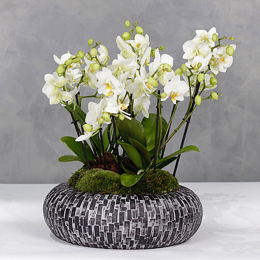 • 10 White Midi Orchids Stems Plant Fresh Ball Moss & Bark Comes in a Black Stone Acrylic Bowl Perfect to amp-up the aesthetics of your home or office!