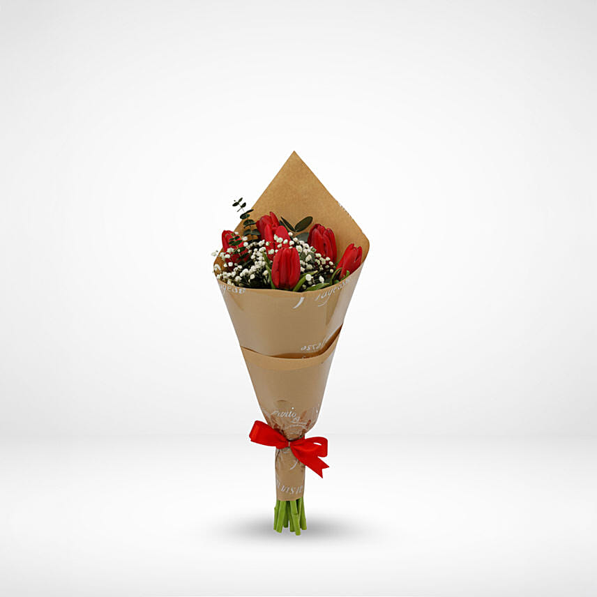 • Beautifully Arranged 6 red tulips with eucalyptus and gypsophiles in Bouquet.
