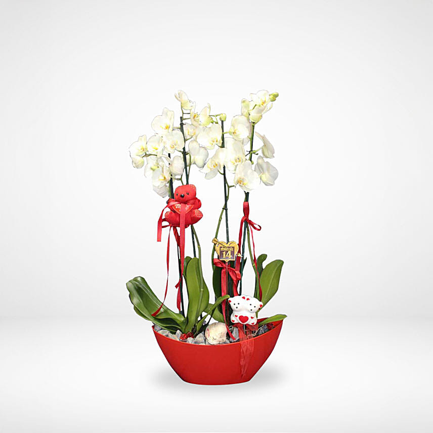 • Beautifully Arranged White Orchid plant in a Hot Red Pot