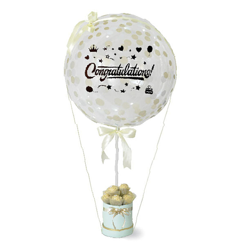 • Ferrero Rocher- 8 PcsConvey your Congratulatory Greetings in style with our Glitter Balloon filled with sparkling confetti and 8pcs of Ferraro Rocher Chocolate.