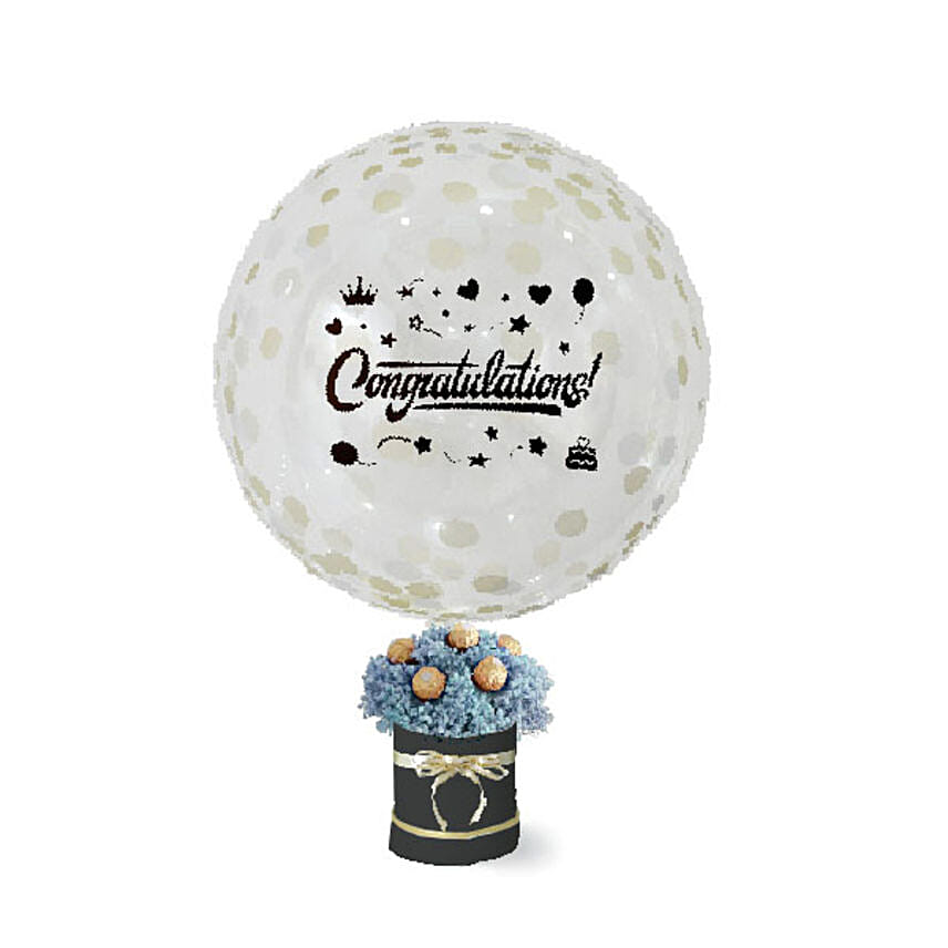 • A jovial flower box of Ferrero Rocher 5pcs serenaded with Baby Breath and a Sparkling Confetti Congrats Balloon.
