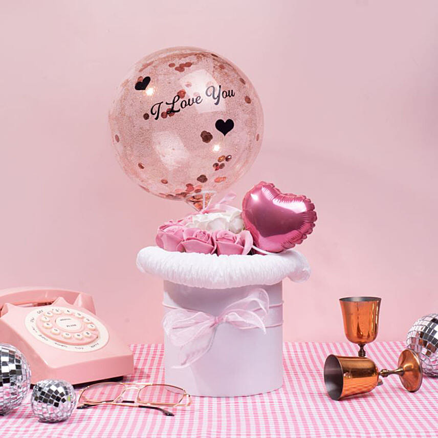 • 5" Pink Heart Shaped Foil Balloon & 10" bubble Balloon stuffed with Glitter & confetti