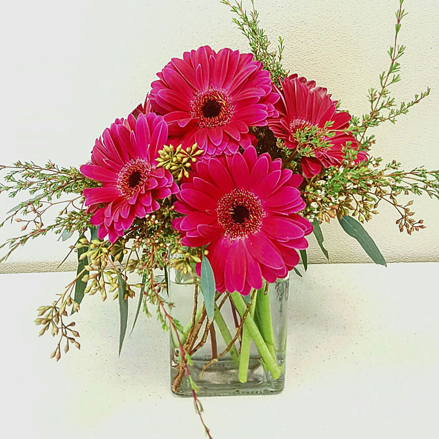 Blissful Dark Pink Gerberas Glass Vase Arrangement