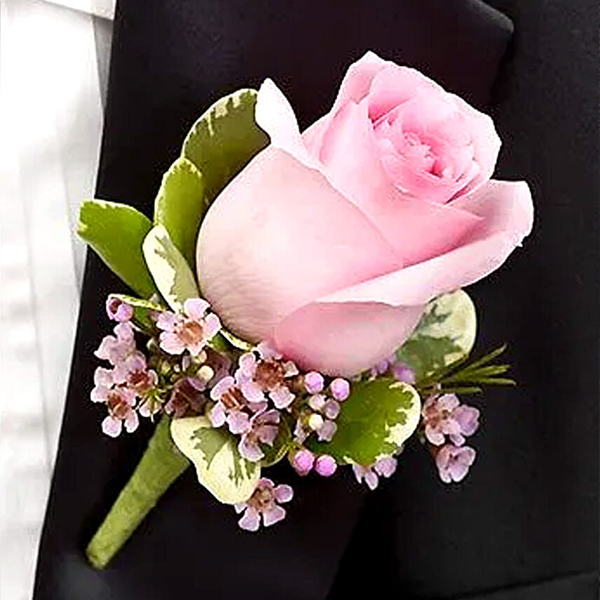 • One Boutonniere with single pink rose, pink wax flowers and pittosporum leaves.
