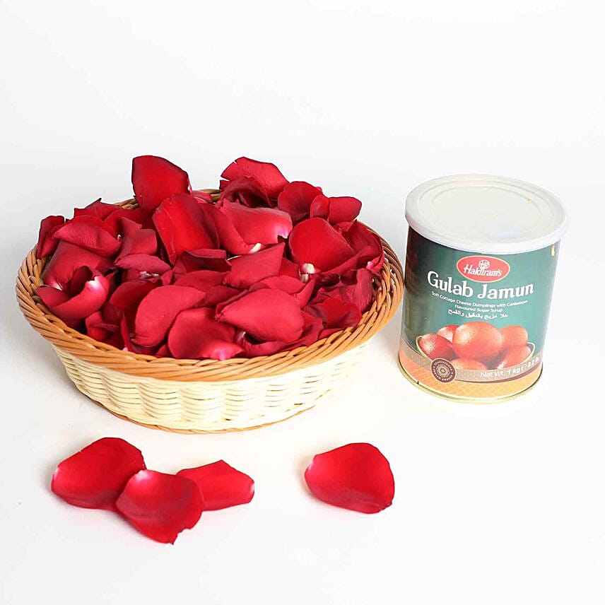 • 1 small cane basket with 200 gms fresh red rose petals.