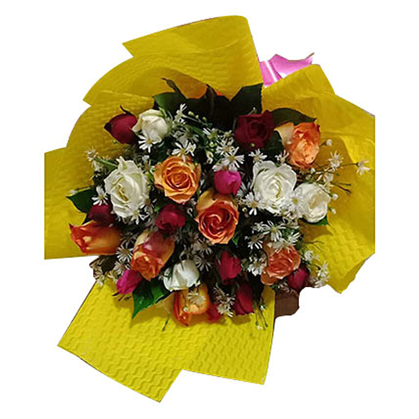 • Flowers were wrapped by yellow card paper, tied with pink ribbon.