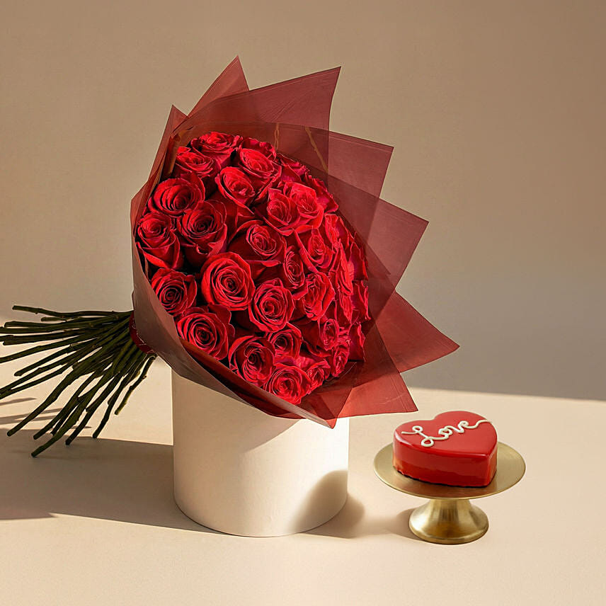 35 Rose Bouquet & Heart Shaped Mono Cake