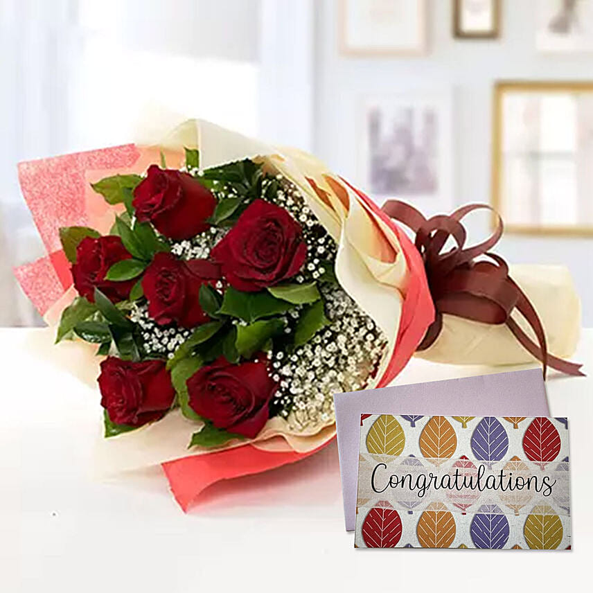 6 Red Roses Bouquet With Handmade Congratulations Card