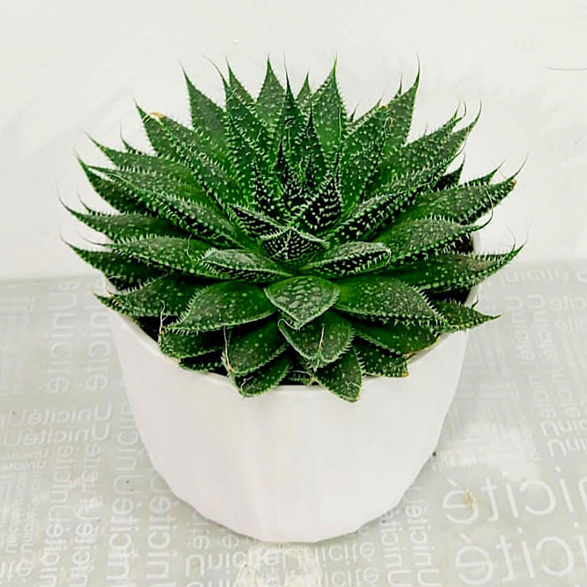 Lace Aloe may be small in size, but it is one of the strongest aloe plants. Also known as torch plant, this plant is resilient and easy to grow in almost all types of weather and growing conditions. The leaves of this plant are triangular and are covered with white spikes and fine cilia, which are a common identifier of the Asphodelaceae plant family. The torch plant can grow up to 16-18 inches (40-45cm). Its branches are covered with peach-colored flowers in the summer, which helps attract bees.