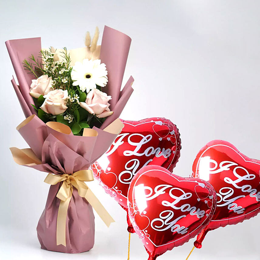 Attractive Roses & Gerberas Bouquet With I Love You Balloons
