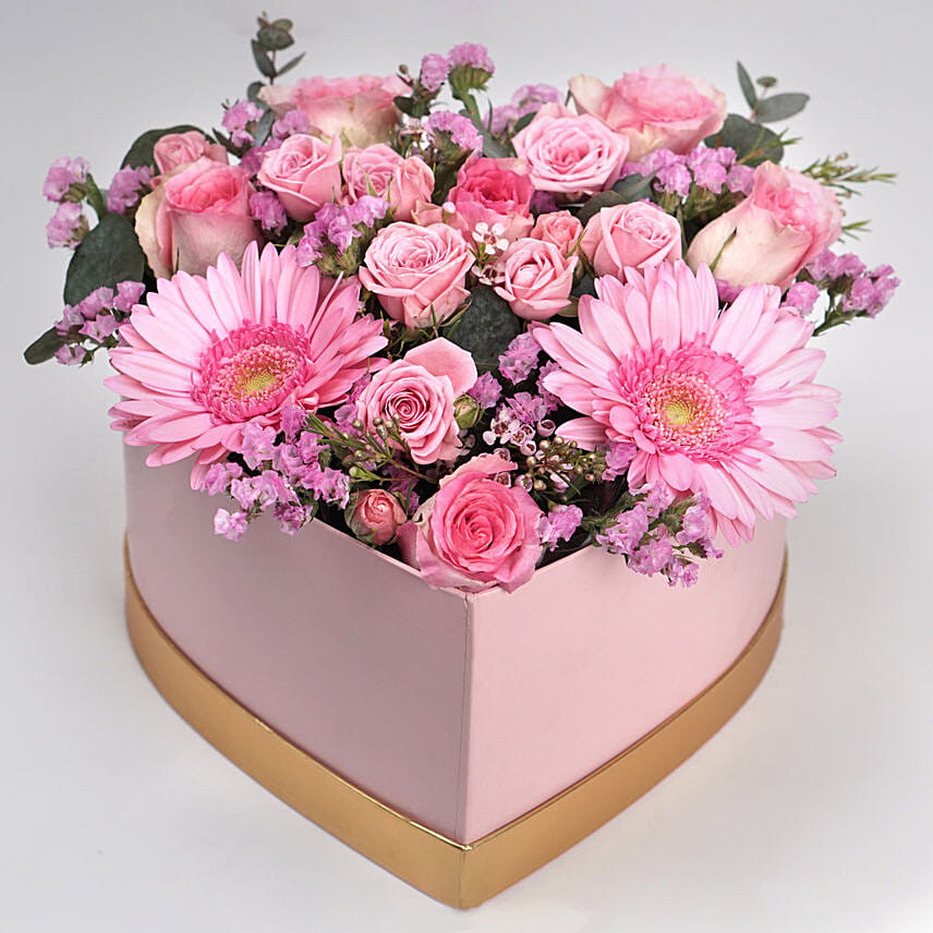 • Arranged in a Pink Heart Shaped Box