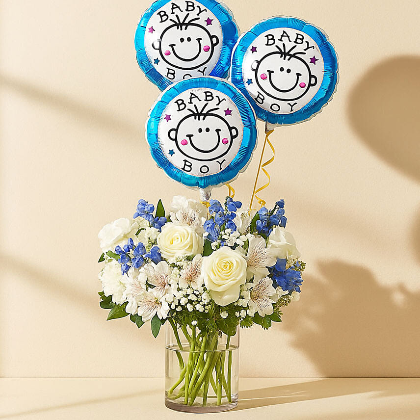 Blue and White Flower Arrangement With Balloons